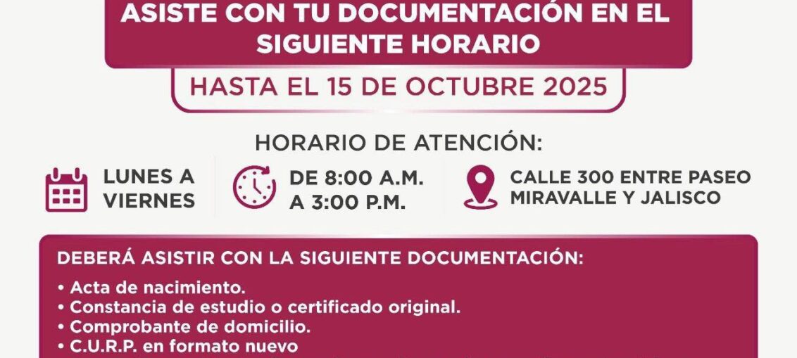 Con el fin de facilitar la atención en estos últimos días de la convocatoria, se estará brindando servicio este sábado 11 de octubre en horario normal, de 8:00 a.m. a 3:00 p.m., en las oficinas ubicadas en Calle 300 entre Paseo Miravalle y Jalisco, para el trámite de la Cartilla del Servicio Militar Nacional para jóvenes clase 2007 y remisos.