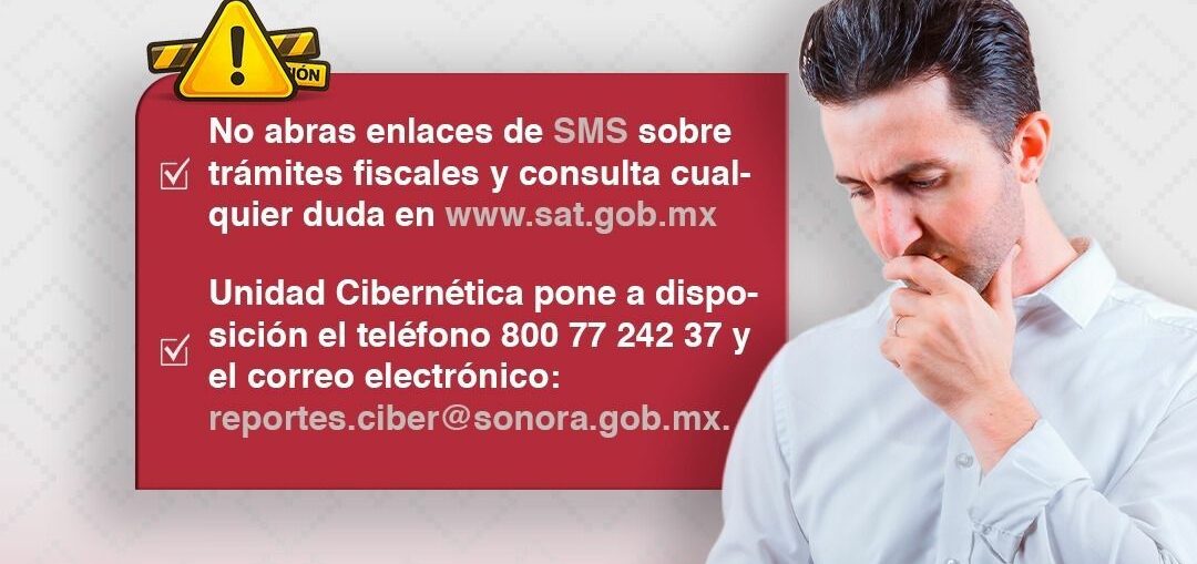 Hermosillo, Sonora; 14 de abril de 2026.- La Secretaría de Seguridad y Protección Ciudadana (SSPC), a través de la Unidad Cibernética, alerta a la ciudadanía sobre mensajes de texto (SMS) falsos que suplantan al Servicio de Administración Tributaria (SAT) con el fin de obtener información personal y bancaria, conocido como “smishing”.