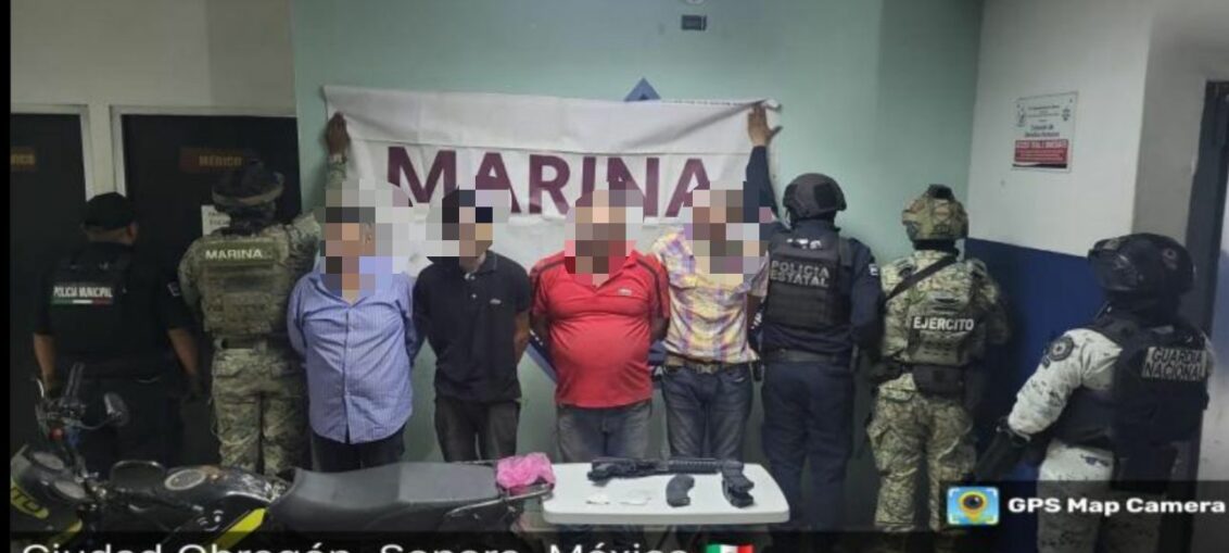 Tras un reporte al C5i por detonaciones de arma de fuego en la comisaría de Cócorit, elementos del operativo coordinado de la Secretaría de Seguridad Pública Municipal, Secretaría de Marina, Guardia Nacional, Policía Estatal y Defensa detuvieron a cuatro hombres y aseguraron un arma de fuego, cartuchos y dosis de presunta droga.